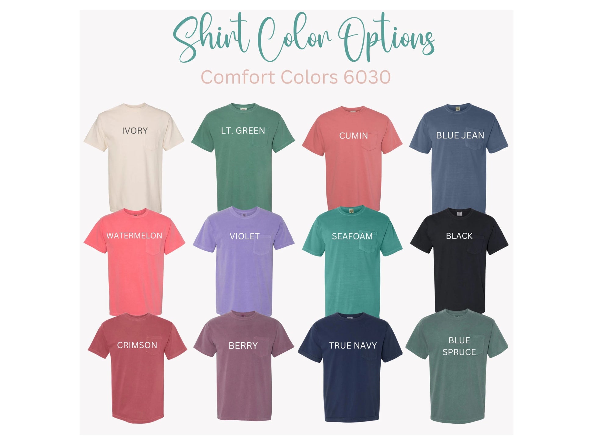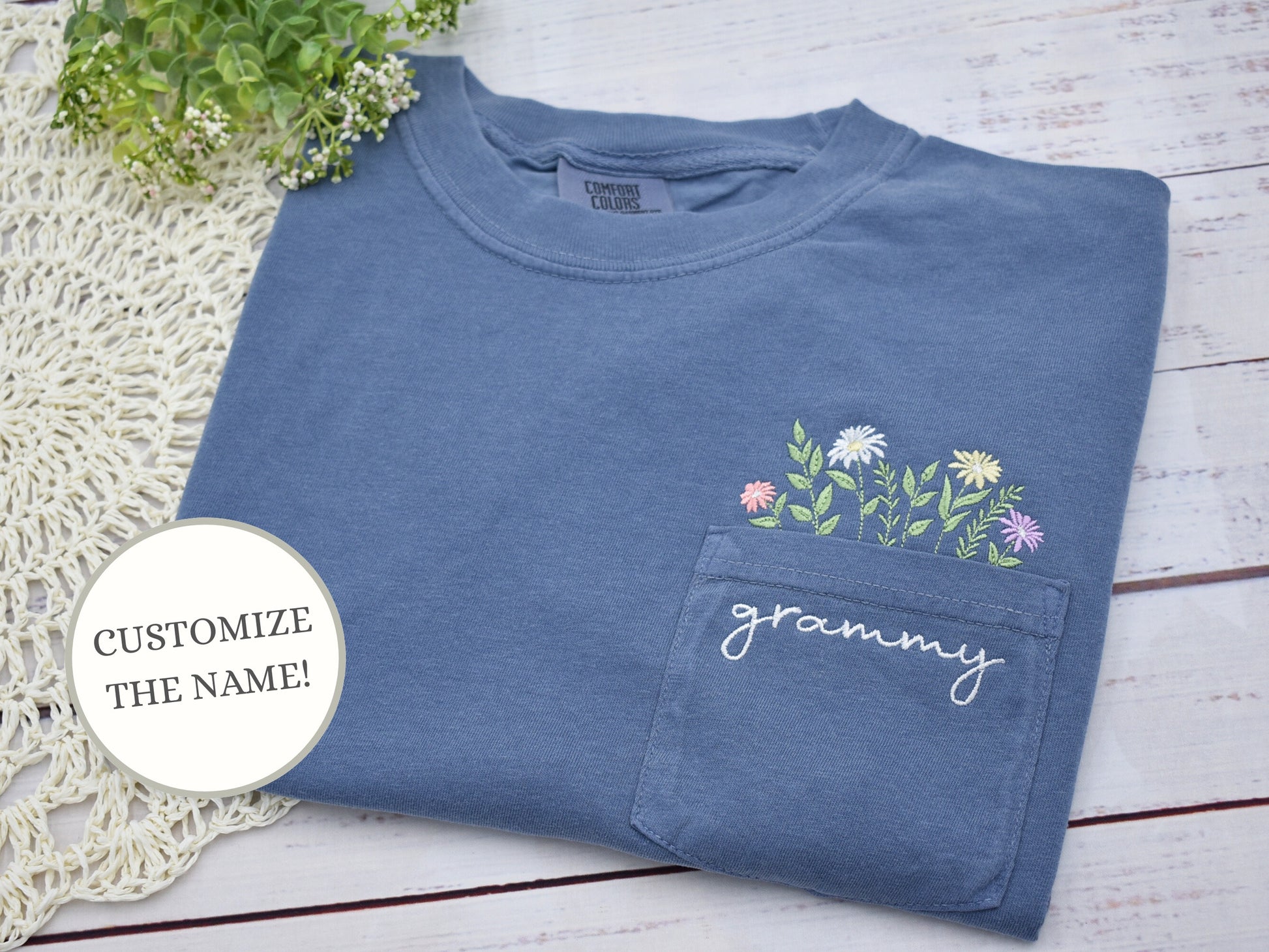 Our personalized wildflower tshirt features a unique, stylish touch with delicate embroidered wildflowers sprouting from the pocket. This trendy Comfort Colors tee makes a perfect Mother's Day or birthday gift for that special grandmother in your life!