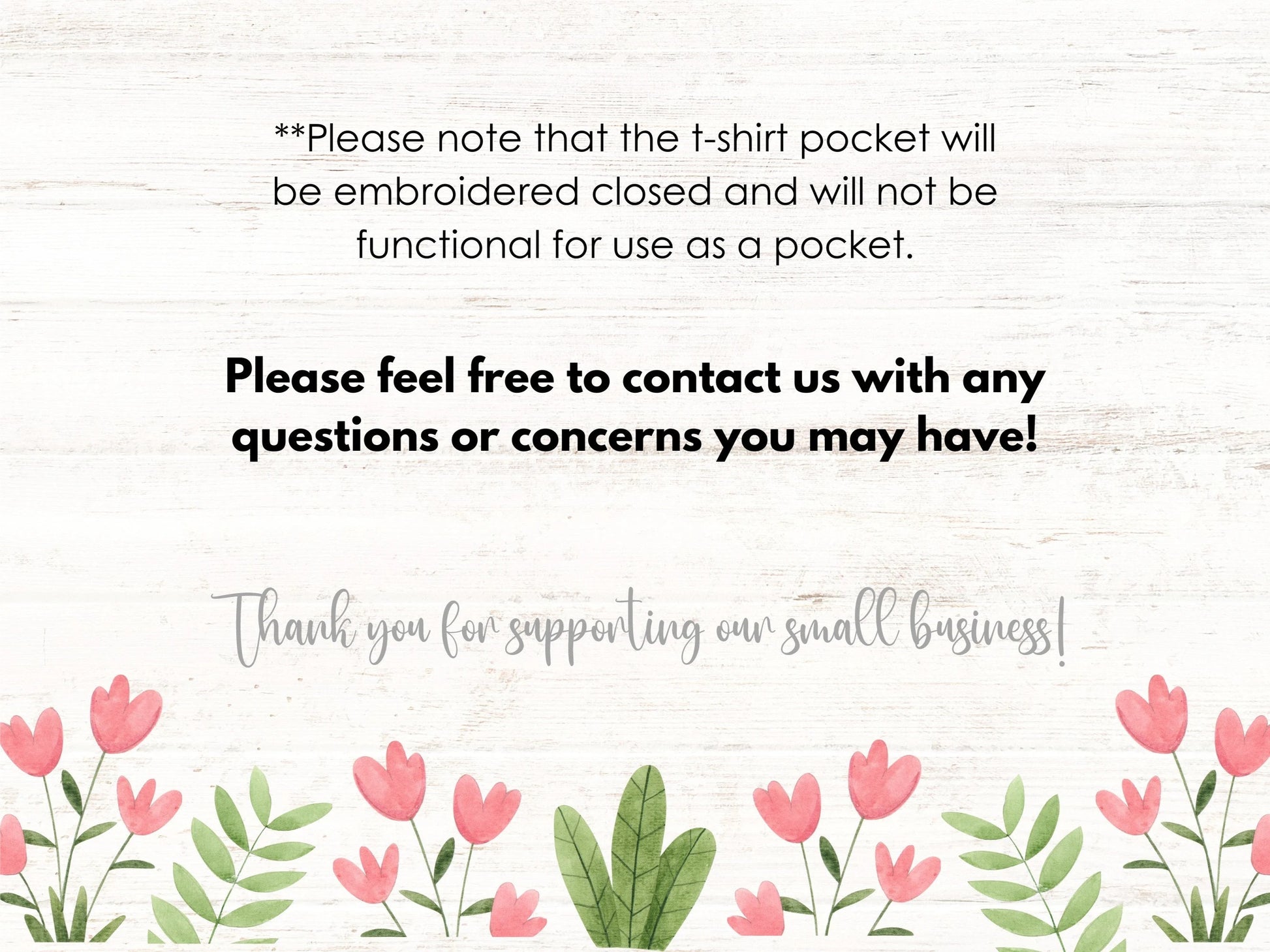 ❤ Each shirt is embroidered just for you. Unfortunately, we can’t accept exchanges or returns due to size or shipping/production times. Please check all the listing details carefully before ordering.